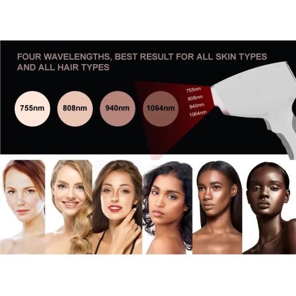 This advanced device integrates four powerful wavelengths—808nm, 755nm, 940nm, and 1064nm—offering a customized, highly effective solution for various skin tones and hair types: